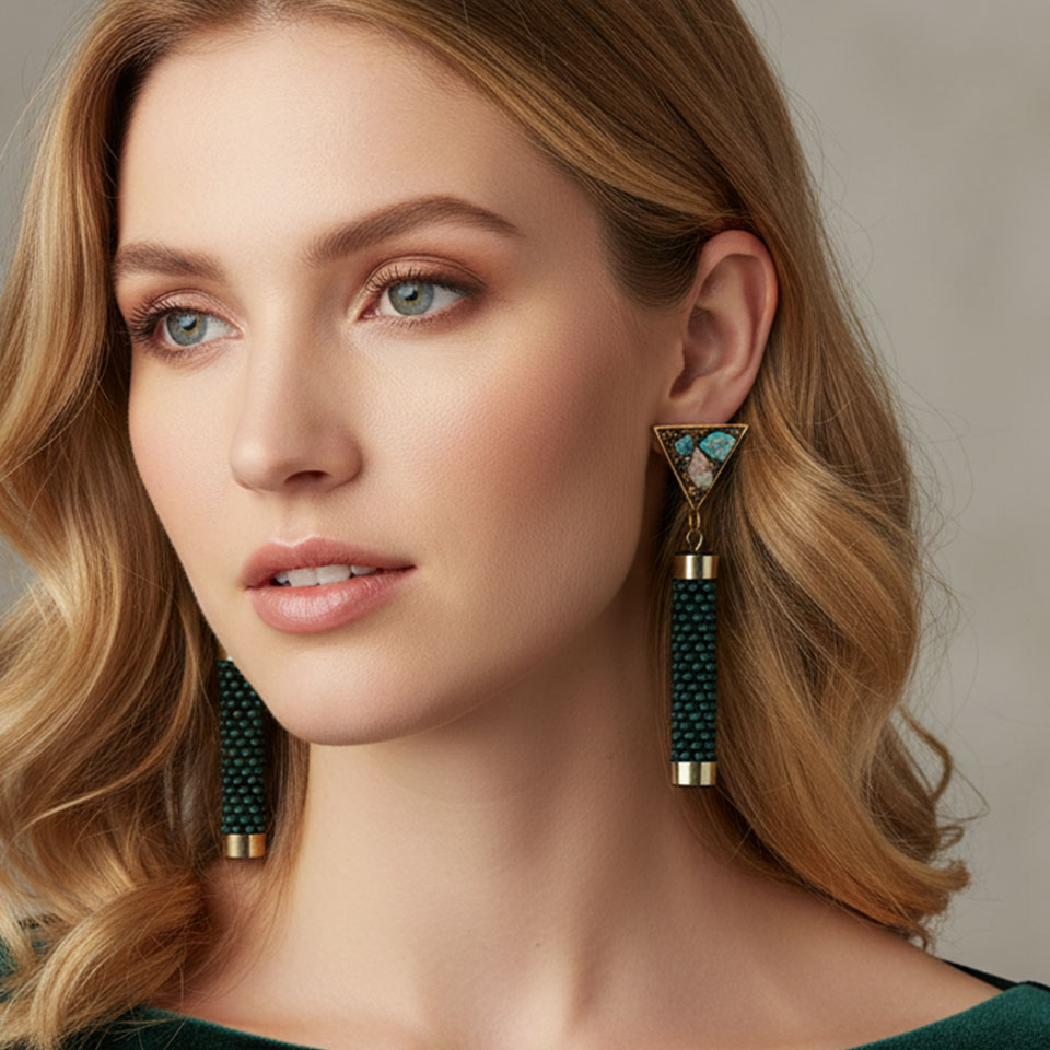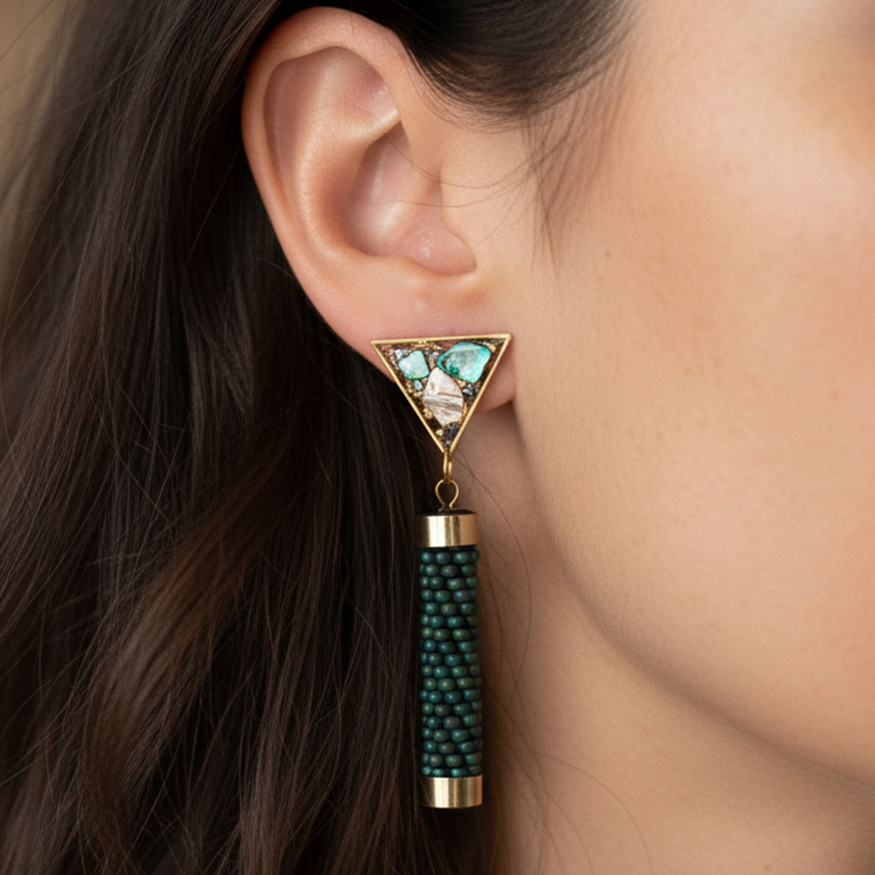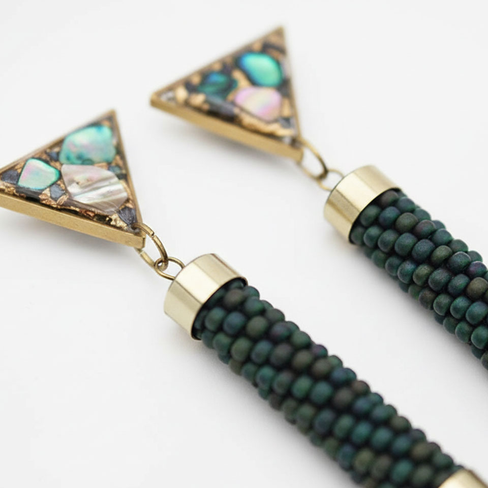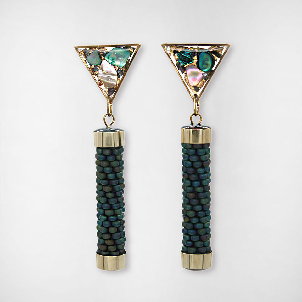 Gli orecchini Cupa Deep uniscono eleganza contemporanea e anima artigianale in un design geometrico raffinato. Il contrasto tra il cilindro in bead crochet e il triangolo luminoso crea un equilibrio armonioso tra texture e luce. Il triangolo in resina, realizzato a mano, racchiude frammenti iridescenti di madreperla con delicate inclusioni in foglia d’oro, mentre la parte cilindrica è tessuta con perline giapponesi Toho. Ogni paio richiede circa 7 ore di lavorazione artigianale.
