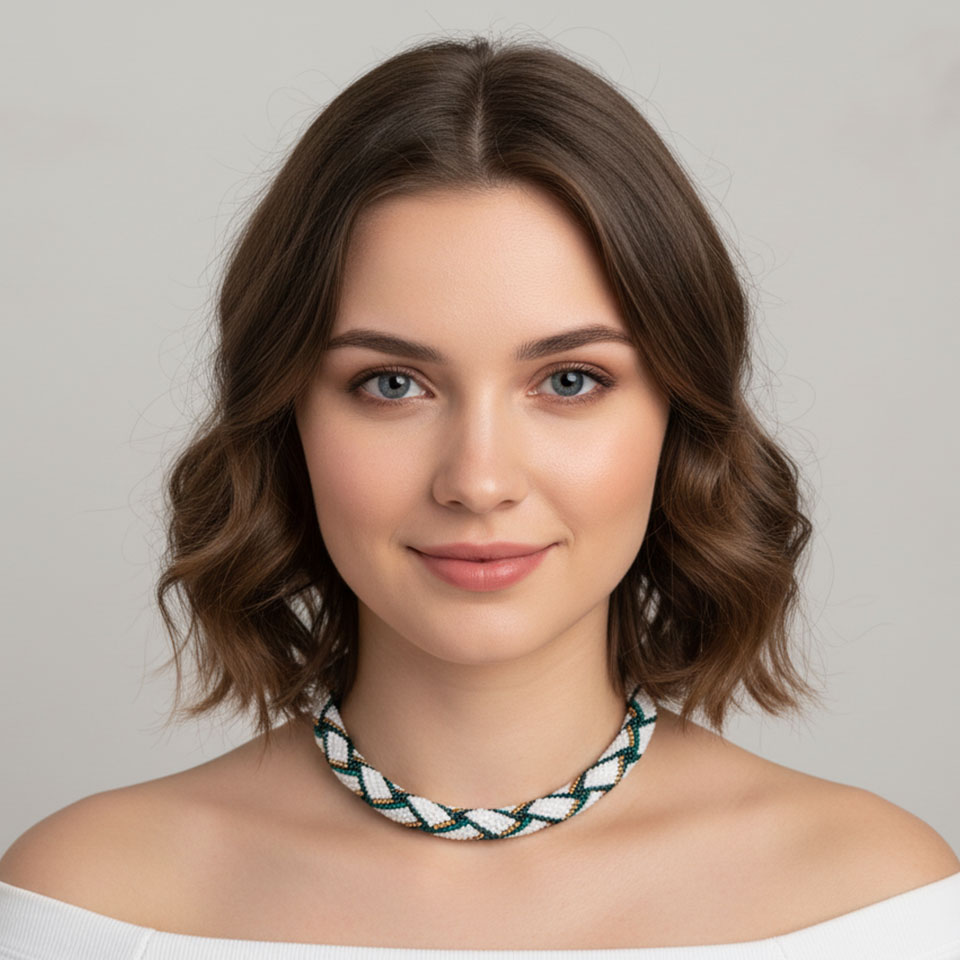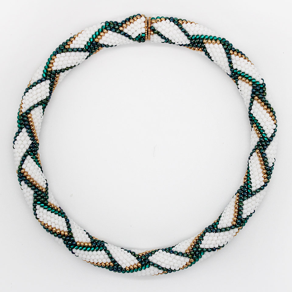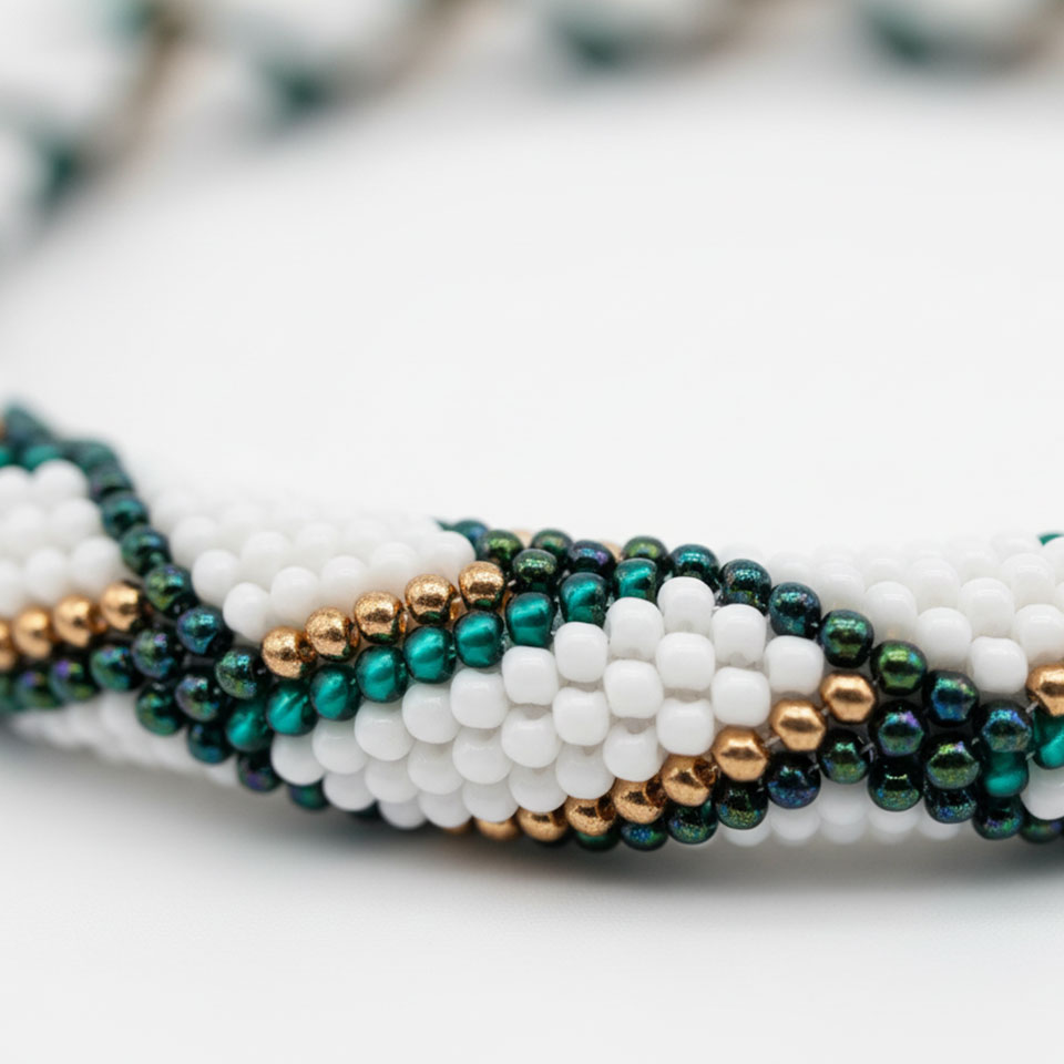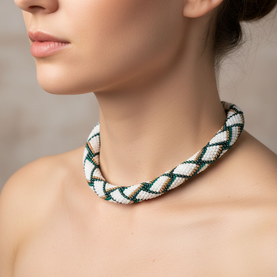 Collana artigianale Cupa Loom, realizzata con la tecnica del bead crochet, che unisce la lavorazione all’uncinetto alla tessitura di perline. Il motivo intrecciato crea un elegante effetto geometrico tridimensionale, esaltando il contrasto tra il bianco luminoso, il verde petrolio e i raffinati dettagli oro. Ogni collana è interamente realizzata a mano con perline giapponesi Toho, apprezzate per la loro precisione e qualità, e rifinita con una chiusura a scomparsa che mantiene la continuità e l’armonia del design.